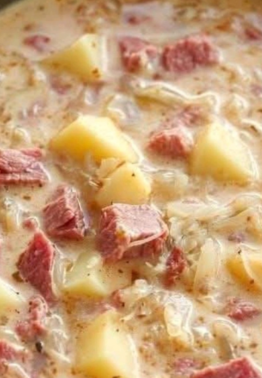 Creamy Reuben Soup is a savory soup that translates the core flavors of a Reuben sandwich into a liquid form. The recipe typically features a base of beef broth and cream, incorporating corned beef, sauerkraut, Swiss cheese, and Russian or Thousand Island dressing flavors. It is a cooked soup that is simmered and thickened before serving.