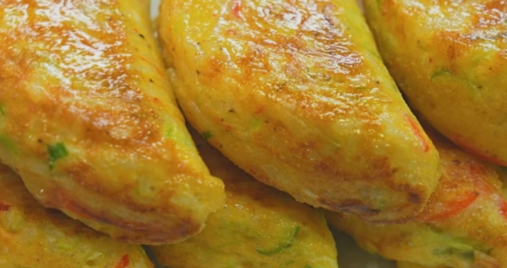 Here is a simple, delicious recipe for the vegetable omelette pockets shown in your image β soft, fluffy, and pan-fried in a round mold, then folded into half-moon shapes.