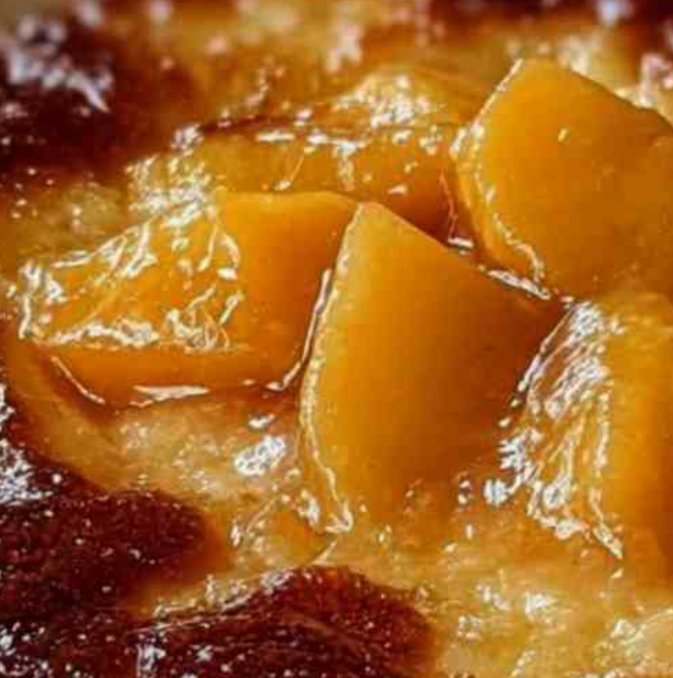 - Carefully pour this sauce over the peach mixture in the baking dish. (Don’t stir—it will sink down and form a rich caramel sauce as it bakes.)